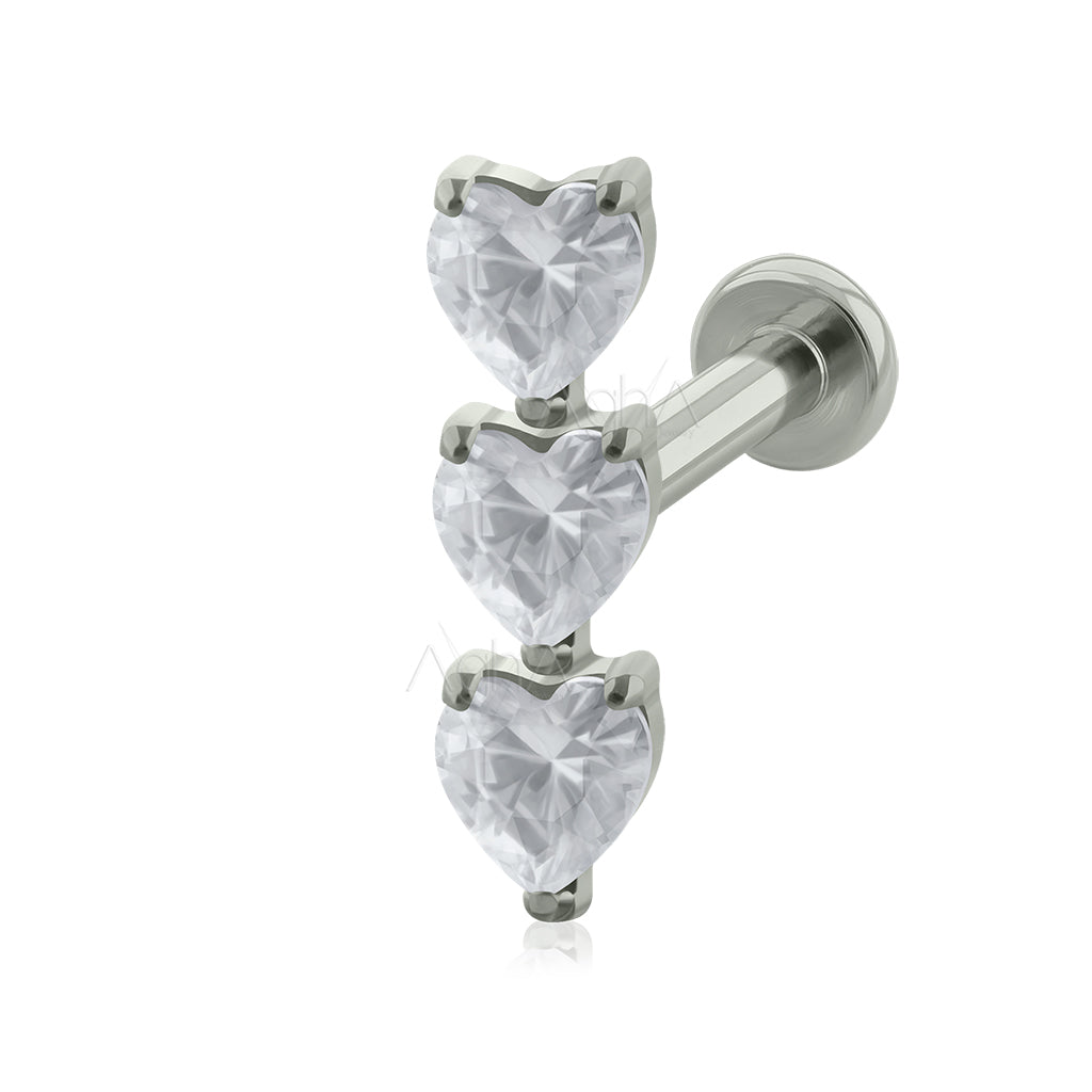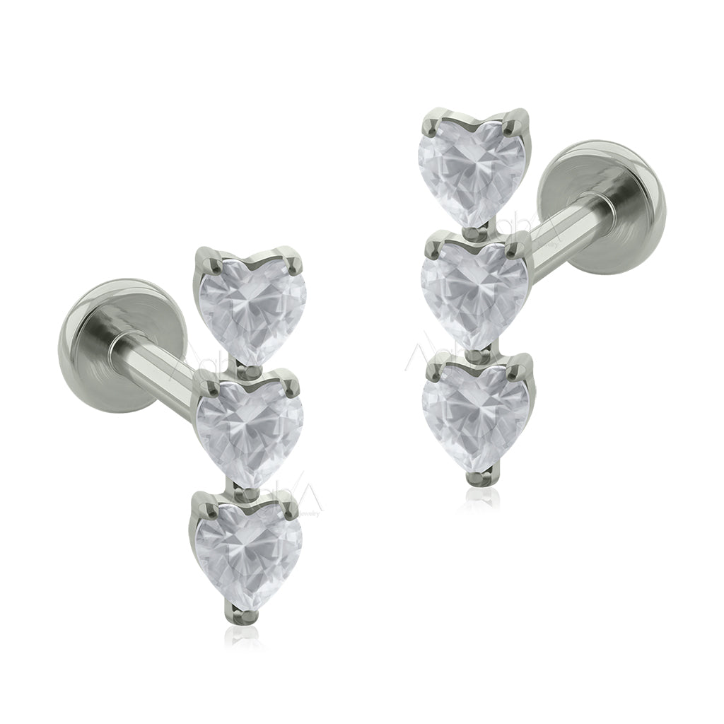 18G Titanio Grado Implante , Accesorio Cluster triple Heart, Prong Setting con Cristales Zirconia, Perforación en el Lóbulo y Cartílago.