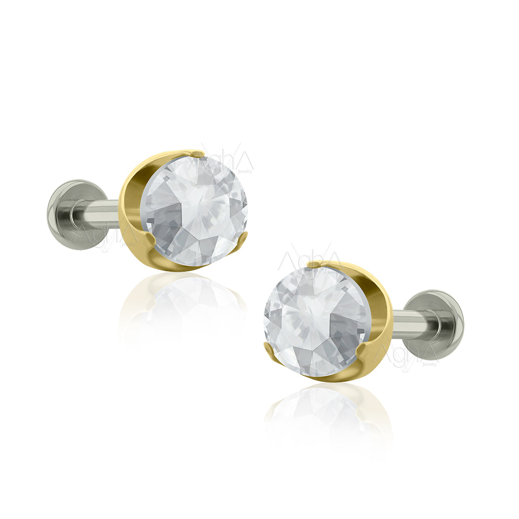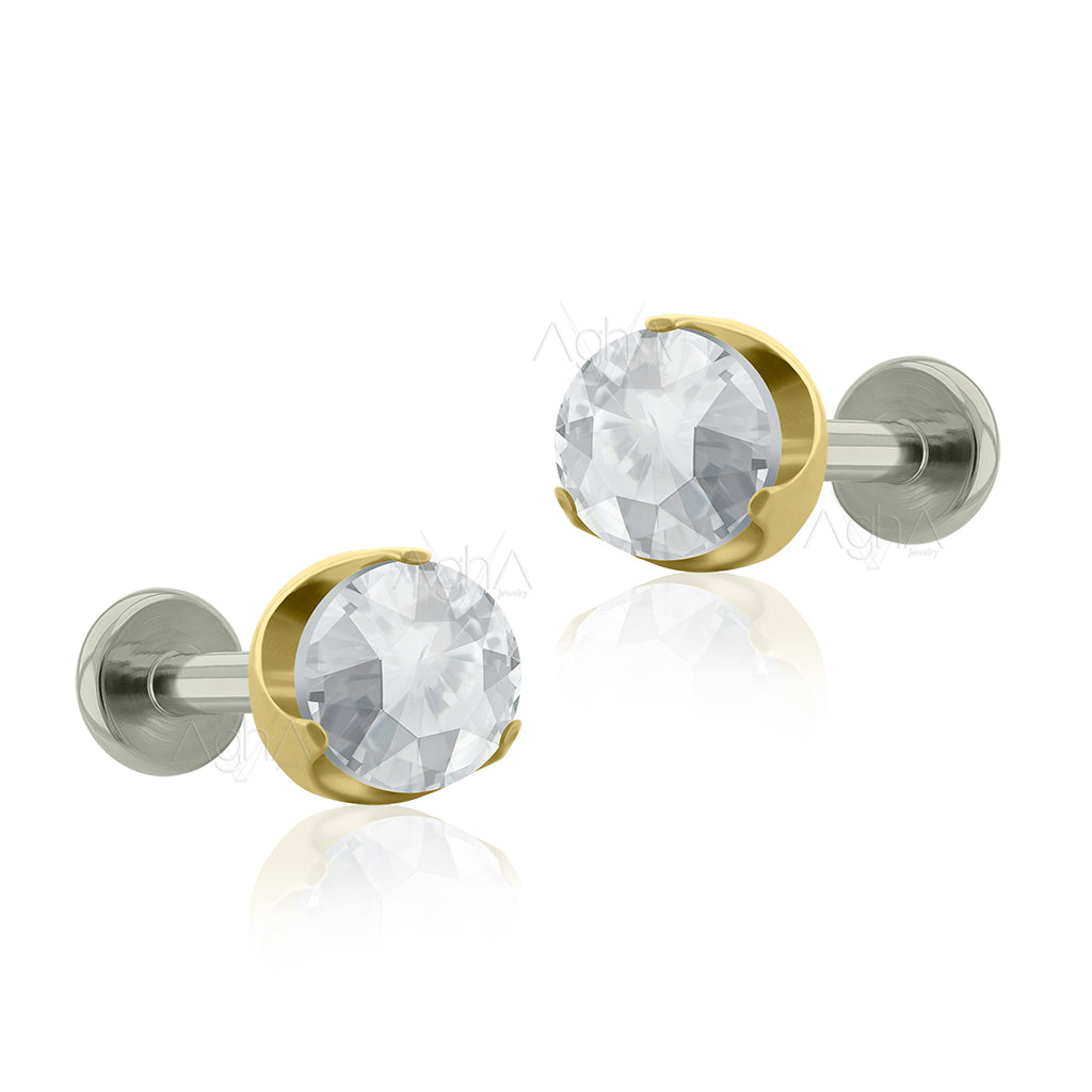 18G Titanio Platizado Dorado, Grado Implante Arete Piercing Rosca,Accesorio Prong Setting Completo con Cristales Zirconia, Perforación en el Lóbulo y Cartílago.