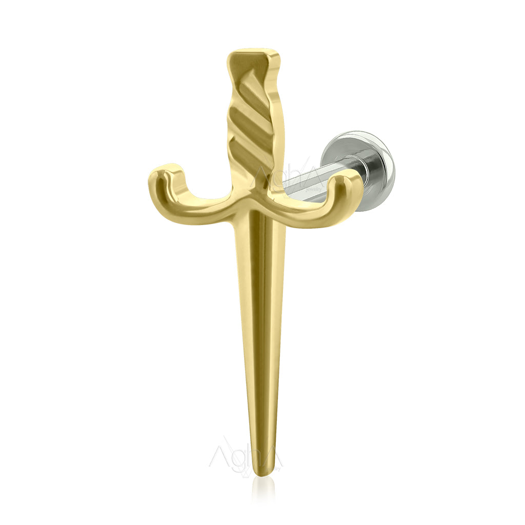 18G, Accesorio de Titanio Platizado Dorado Grado Implante, Accesorio Gran Espada con Rosca Interna y Barra tipo labret con grosor 1.0mm (calibre 18).