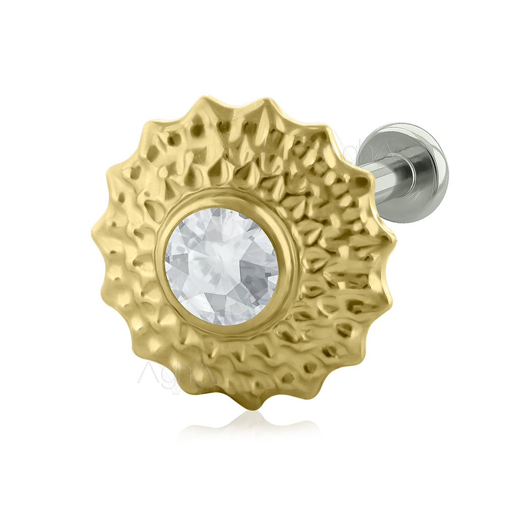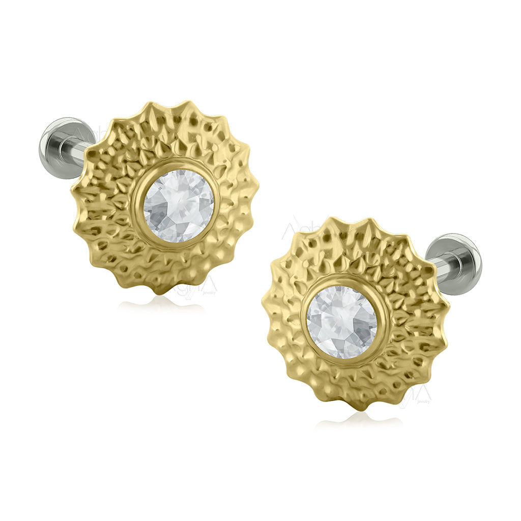 18G Titanio Platizado Dorado Grado Implante , Accesorio Sun Beveling, Bezel setting con Cristales Zirconia, Perforación en el Lóbulo y Cartílago.