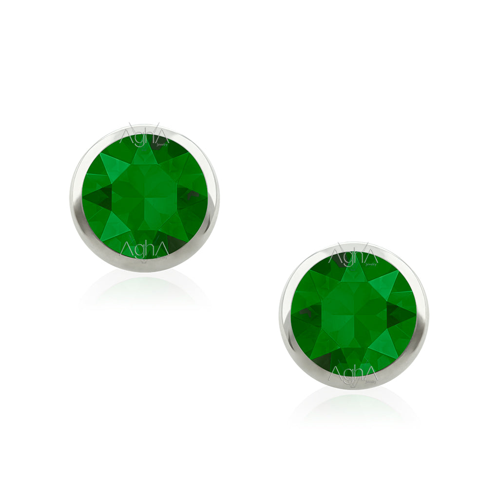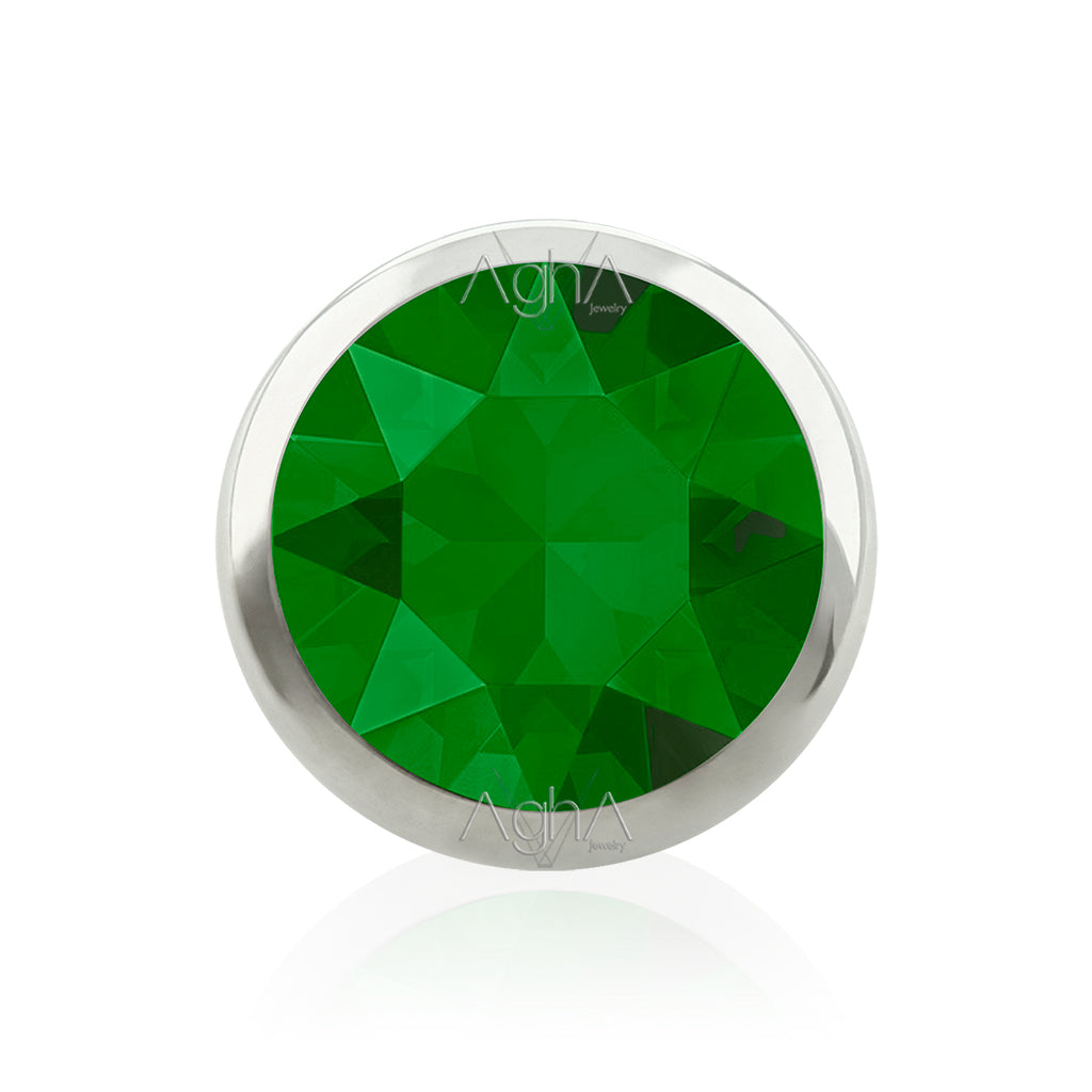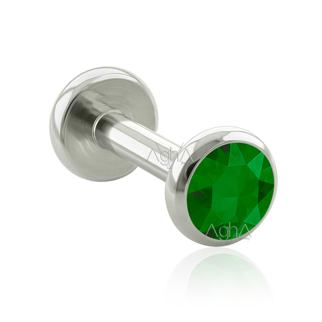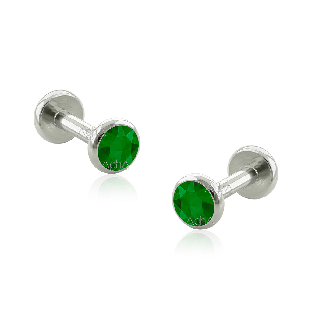 Arete de Titanio Grado Implante, Accesorio con agarre bezel-set de Cristal Verde Esmeralda con Rosca Interna y Barra tipo labret con grosor 1.2mm (calibre 16).