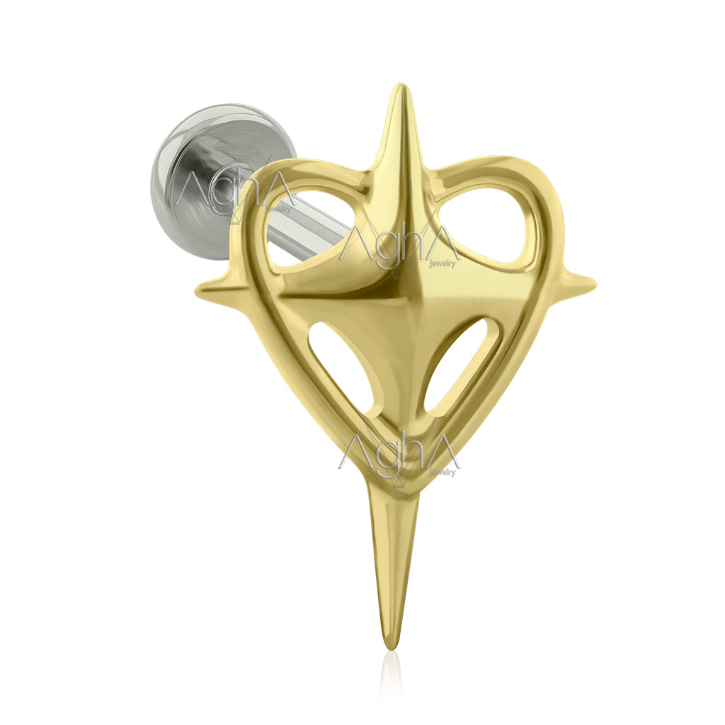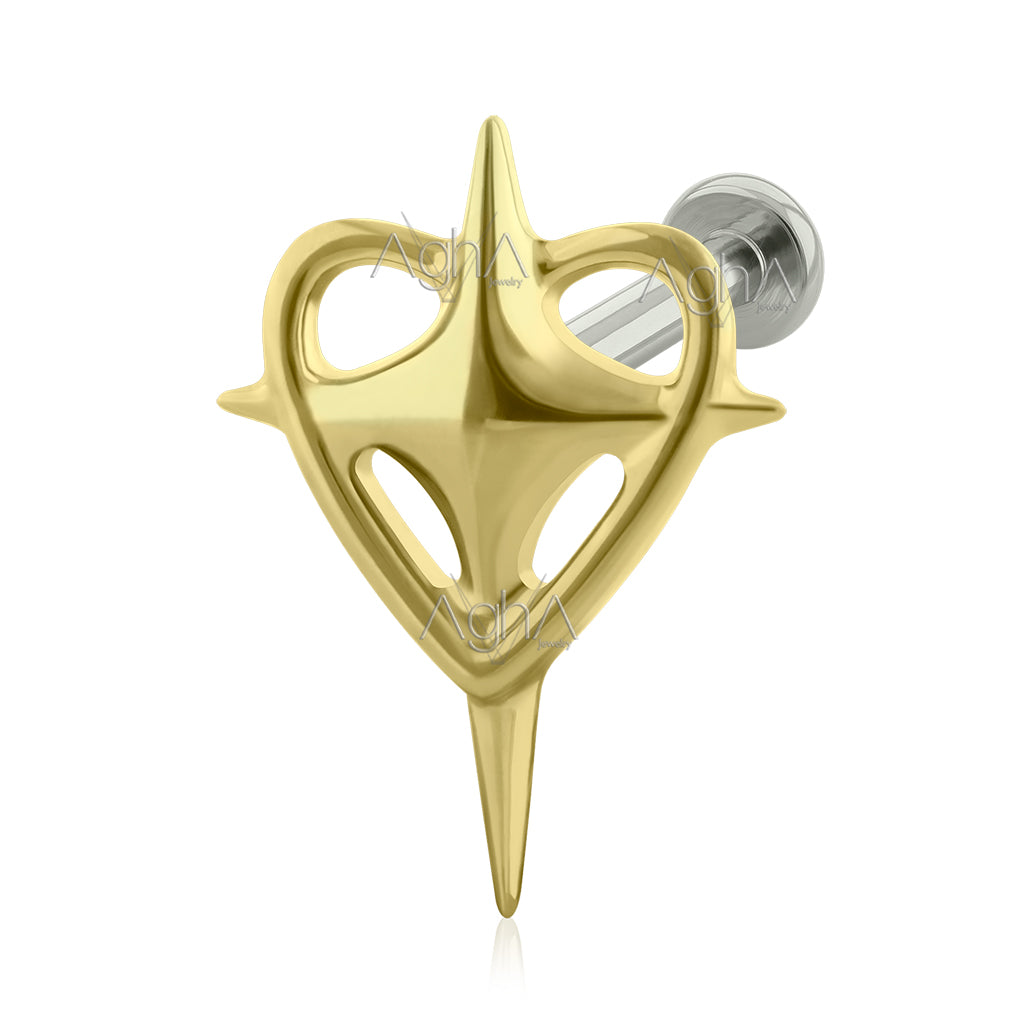 Arete de Titanio Dorado Platizado Grado Implante, Accesorio Shining Heart con Rosca Interna y Barra tipo labret con grosor 1.0mm (calibre 18).