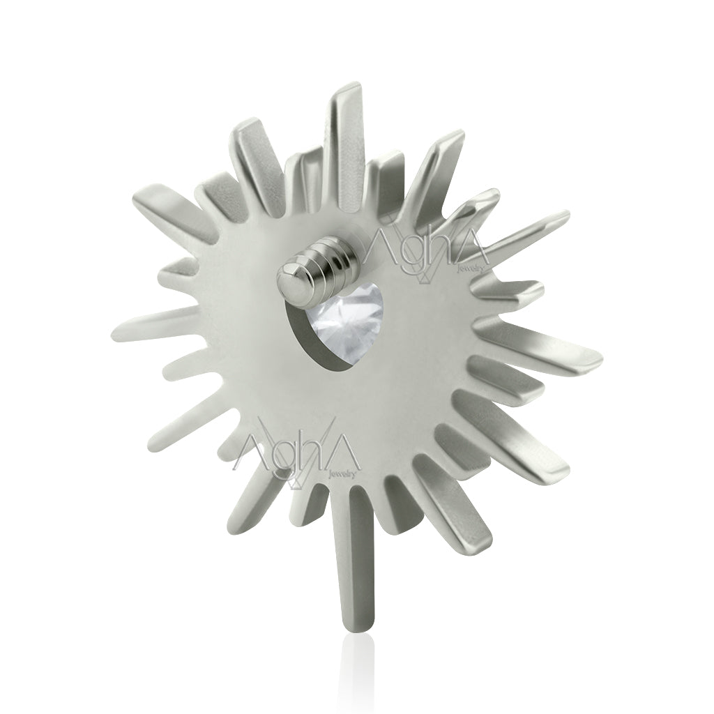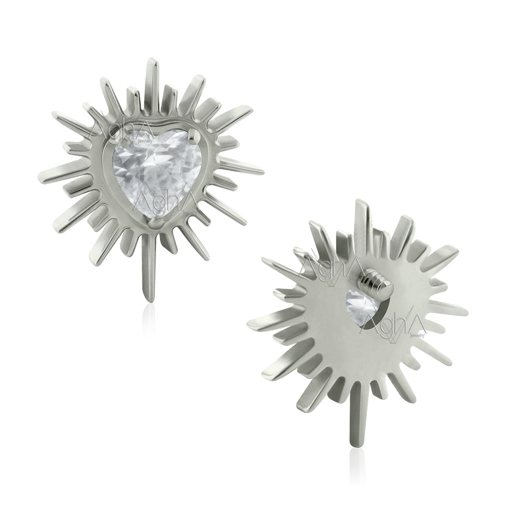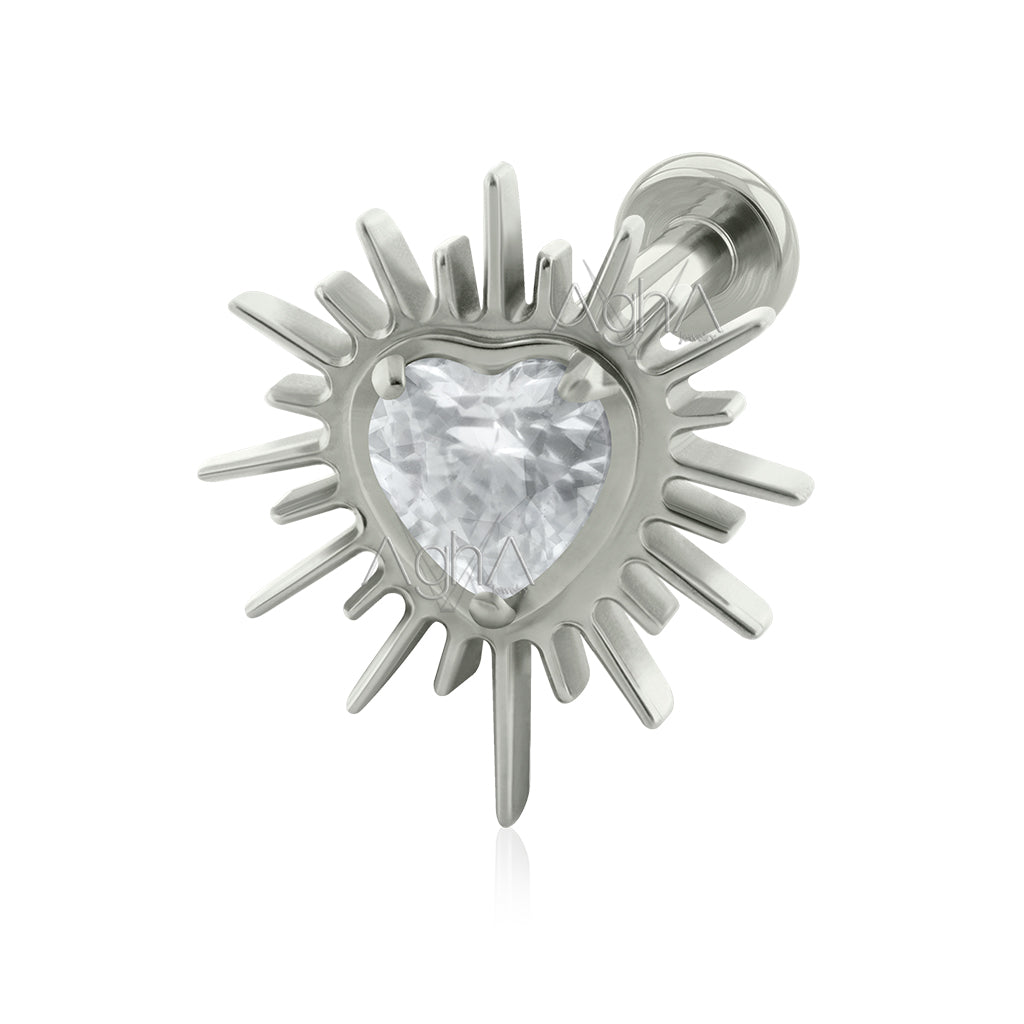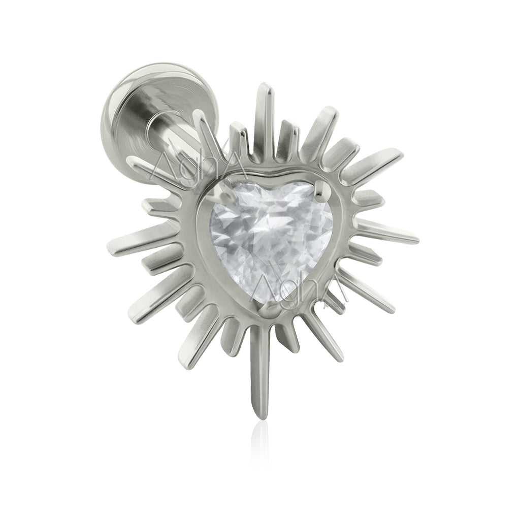 Arete de Titanio Grado Implante, Accesorio Radiant Heart con agarre Prong Setting de Cristales Zirconia, con Rosca Interna y Barra tipo labret con grosor 1.0mm (calibre 18).