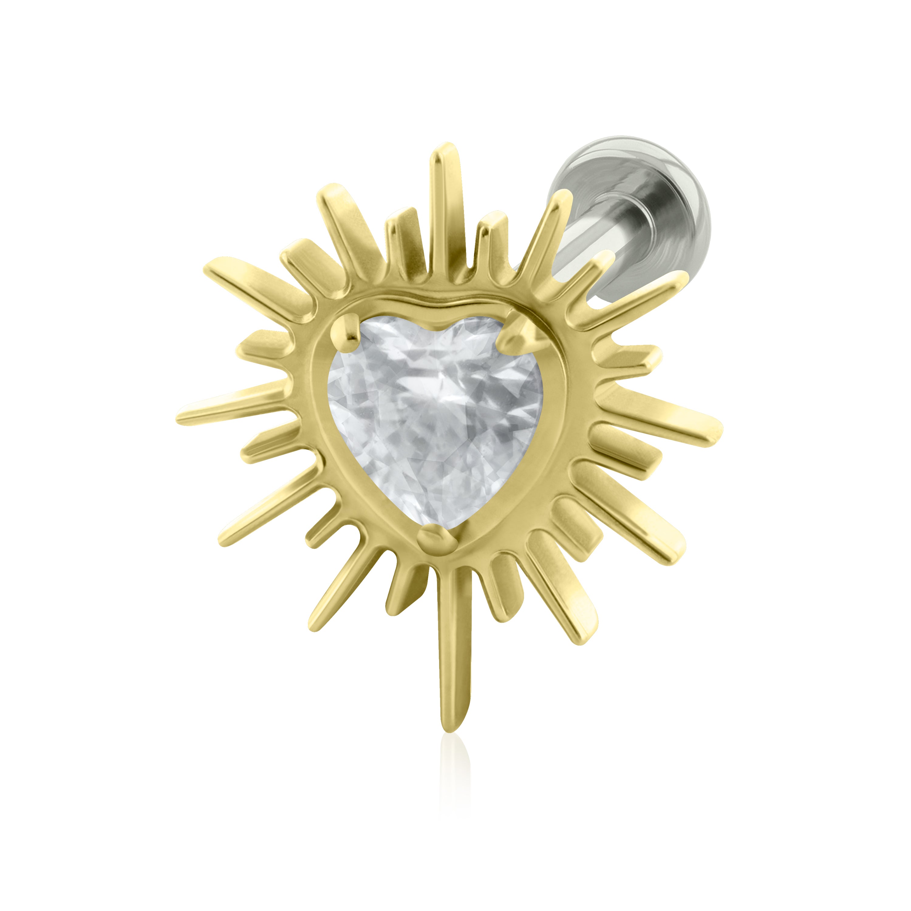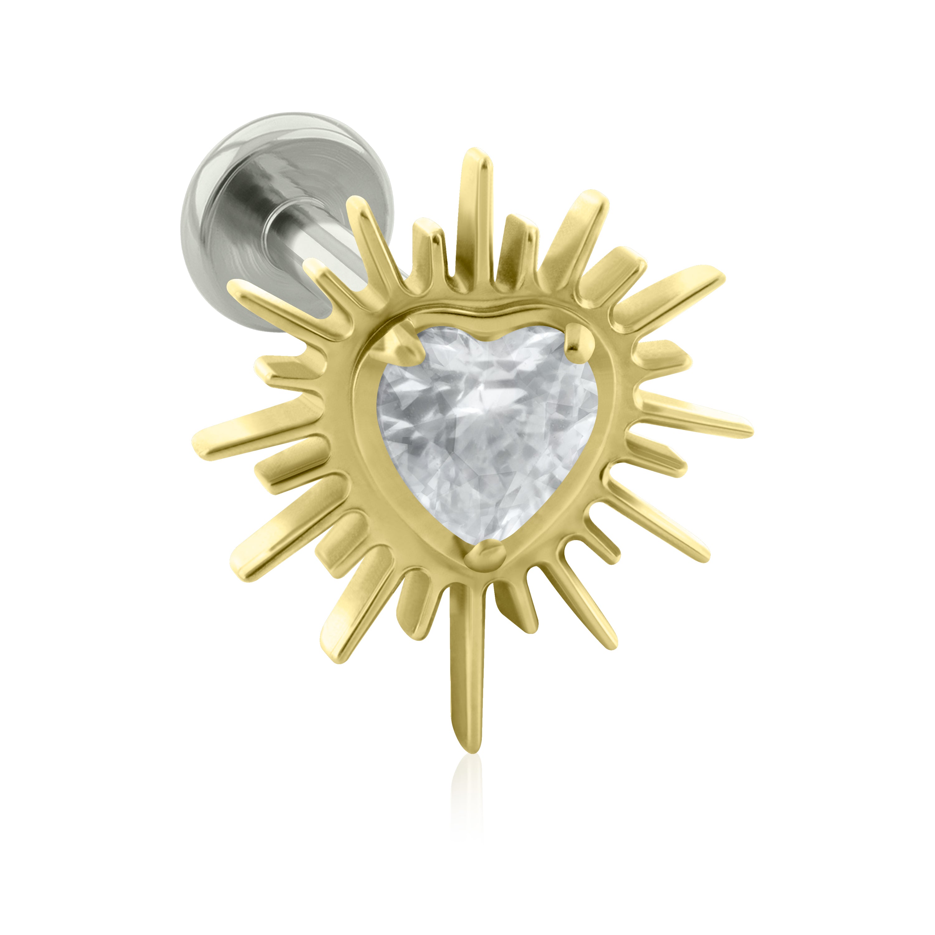 Arete de Titanio Platizado Dorado, Grado Implante, Accesorio Radiant Heart con agarre Prong Setting de Cristales Zirconia, con Rosca Interna y Barra tipo labret con grosor 1.0mm (calibre 18).