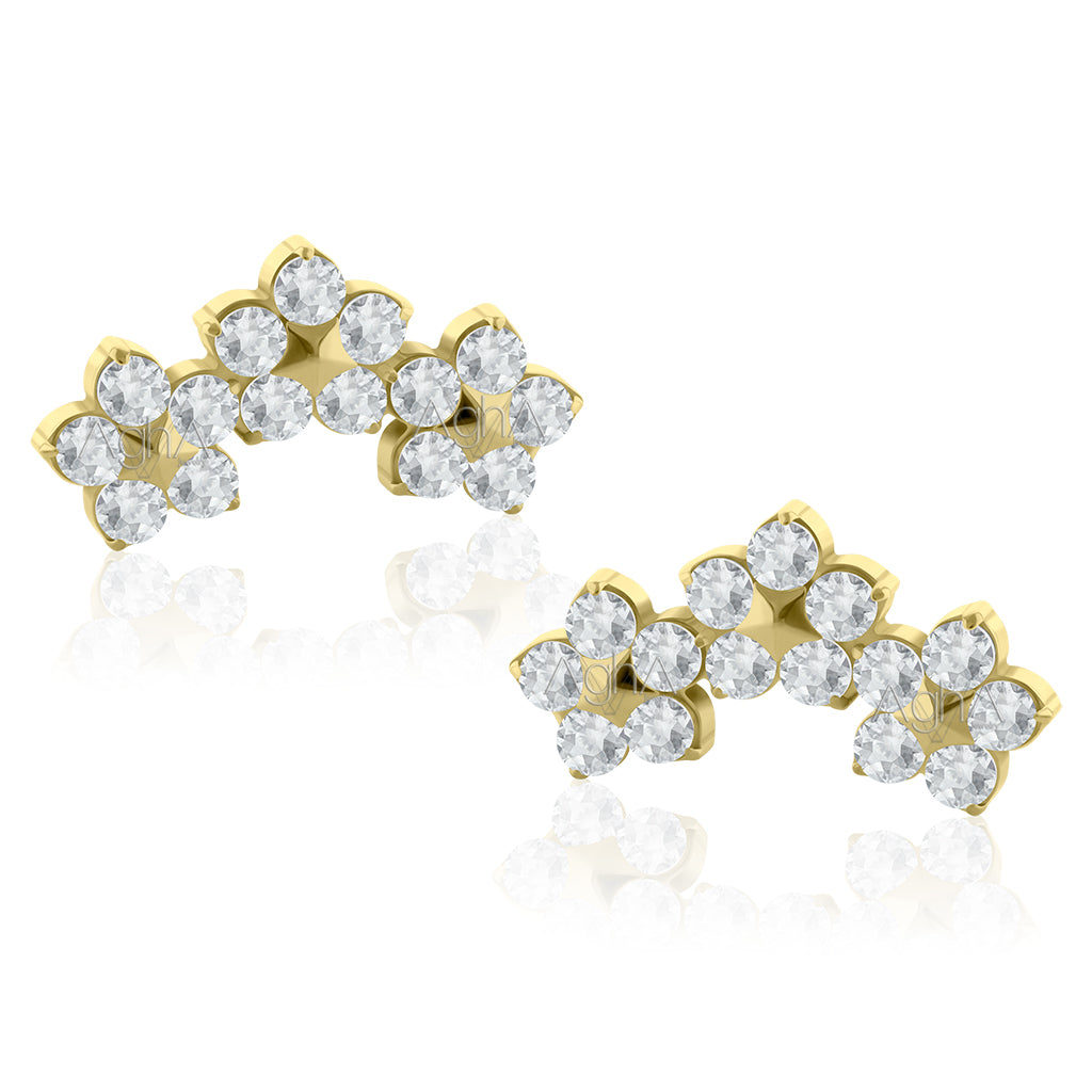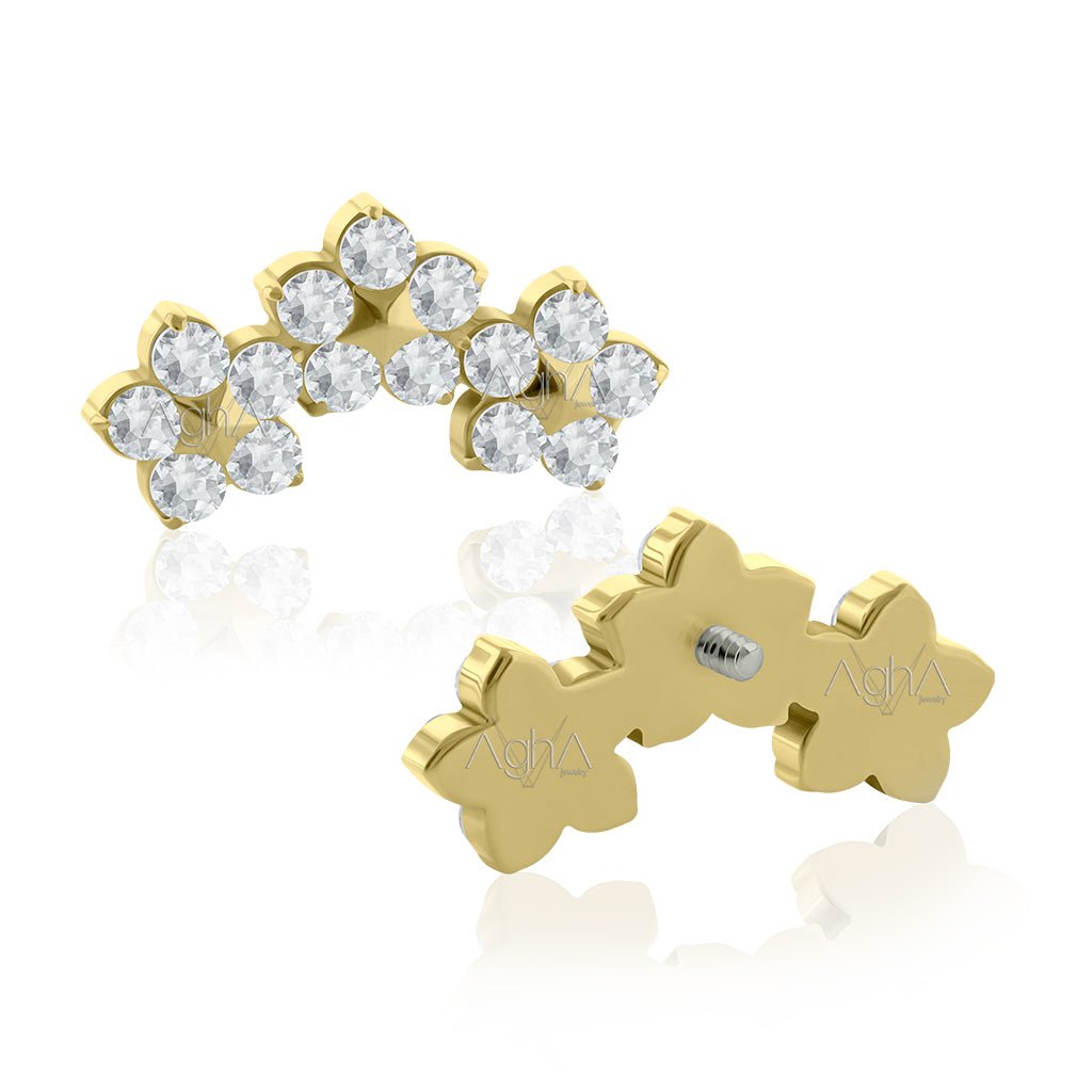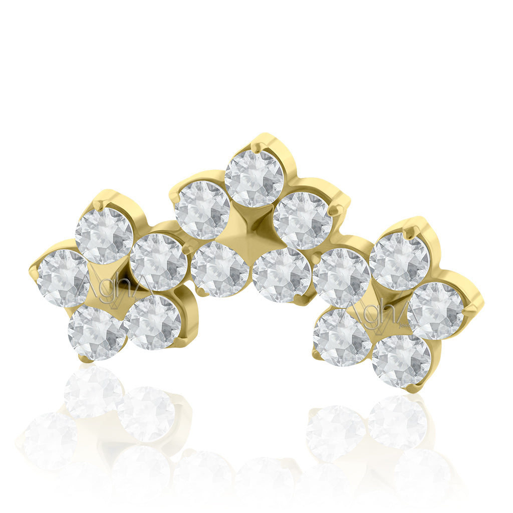 18g-16g Accesorio Triple Flower, Prong Setting con Cristales Zirconia y Titanio Platizado Dorado Grado Implante Rosca Interna (solo el accesorio)// Perforación de Lóbulos, Orejas.