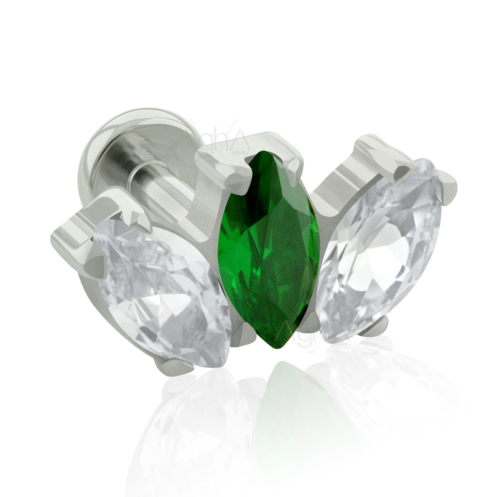 Arete de Titanio Grado Implante, Accesorio Marquise con agarre Prong Setting de Cristales Zirconia, con Rosca Interna y Barra tipo labret con grosor 1.2mm (calibre 16).