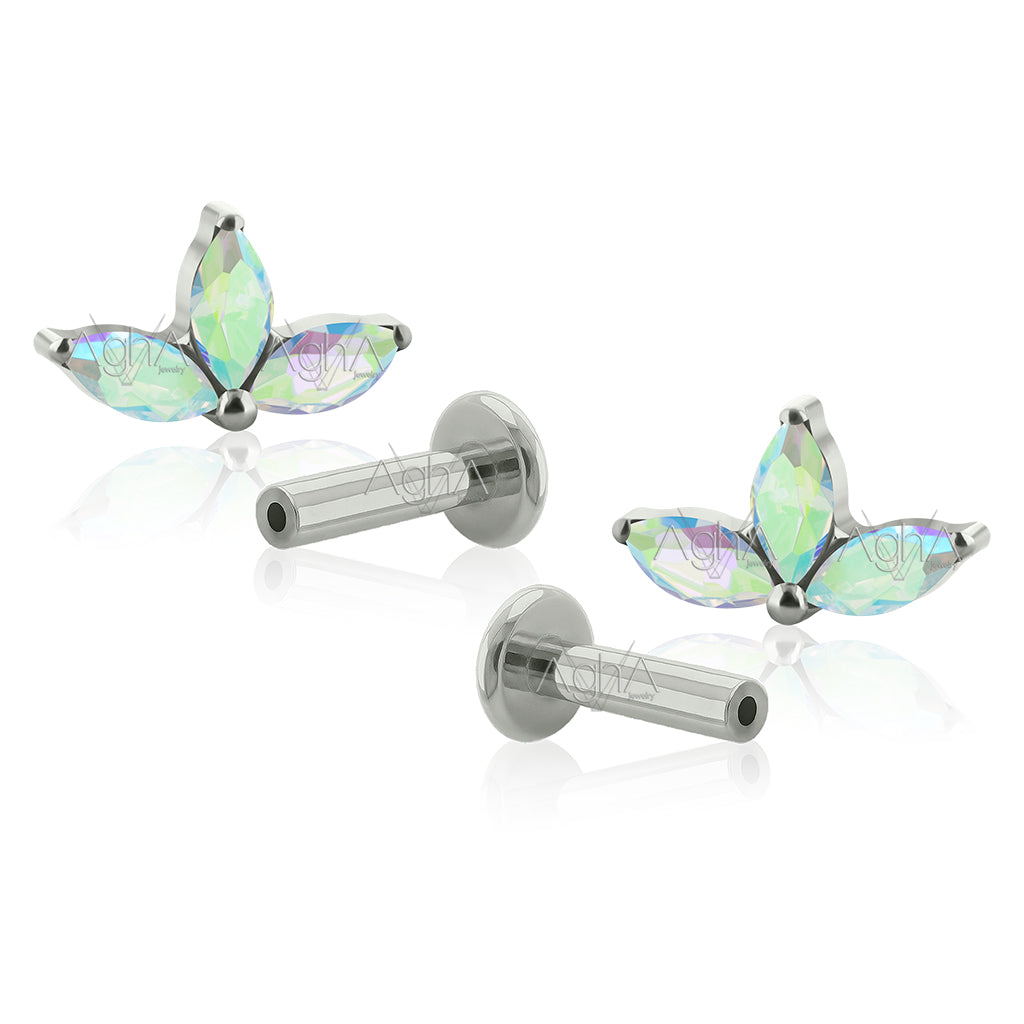 20G Titanio Grado Implante Accesorio Triple Navett Prong Setting con Cristales Zirconia y Barra Tipo Labret de Pin a Presión, Perforación en el Lóbulo, Nariz y Cartílago.